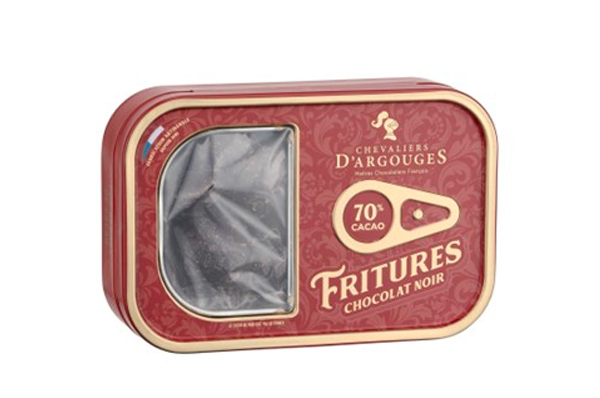 Fondez de plaisir pour nos fritures chocolat noir 70% de cacao le tout présenté dans une élégante boite sardines de 90g.