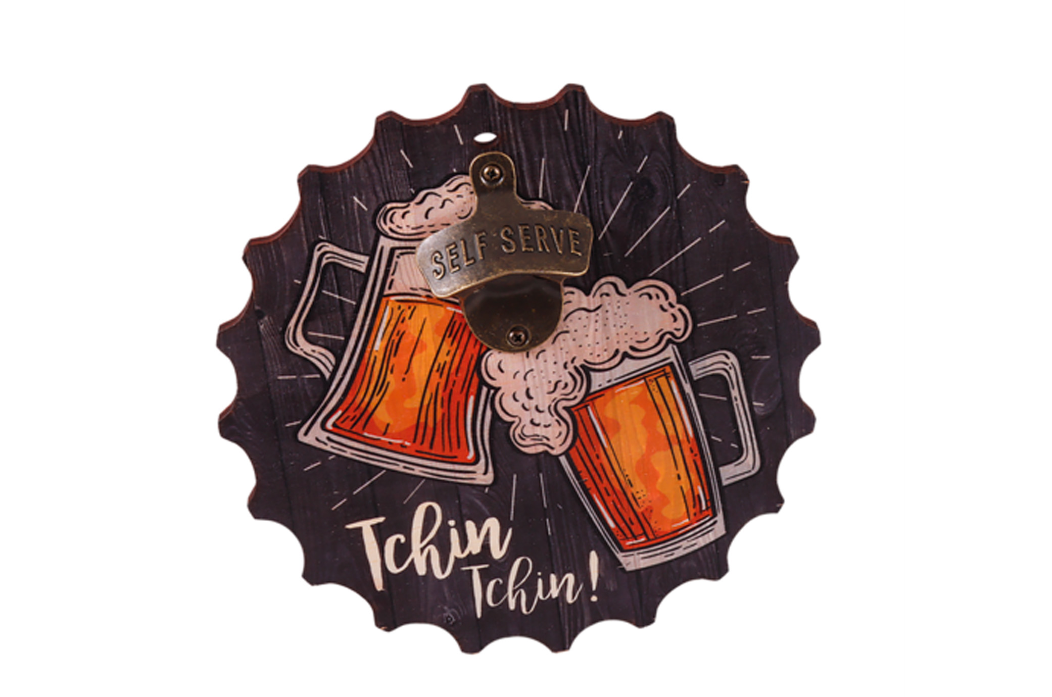 Ce décapsuleur à accrocher au mur est constitué de bois et d'un décapsuleur en métal sur le haut. Il est décoré avec un dessin de 2 chopes de bières sur fond noir, et avec l'inscription "Tchin Tchin !".