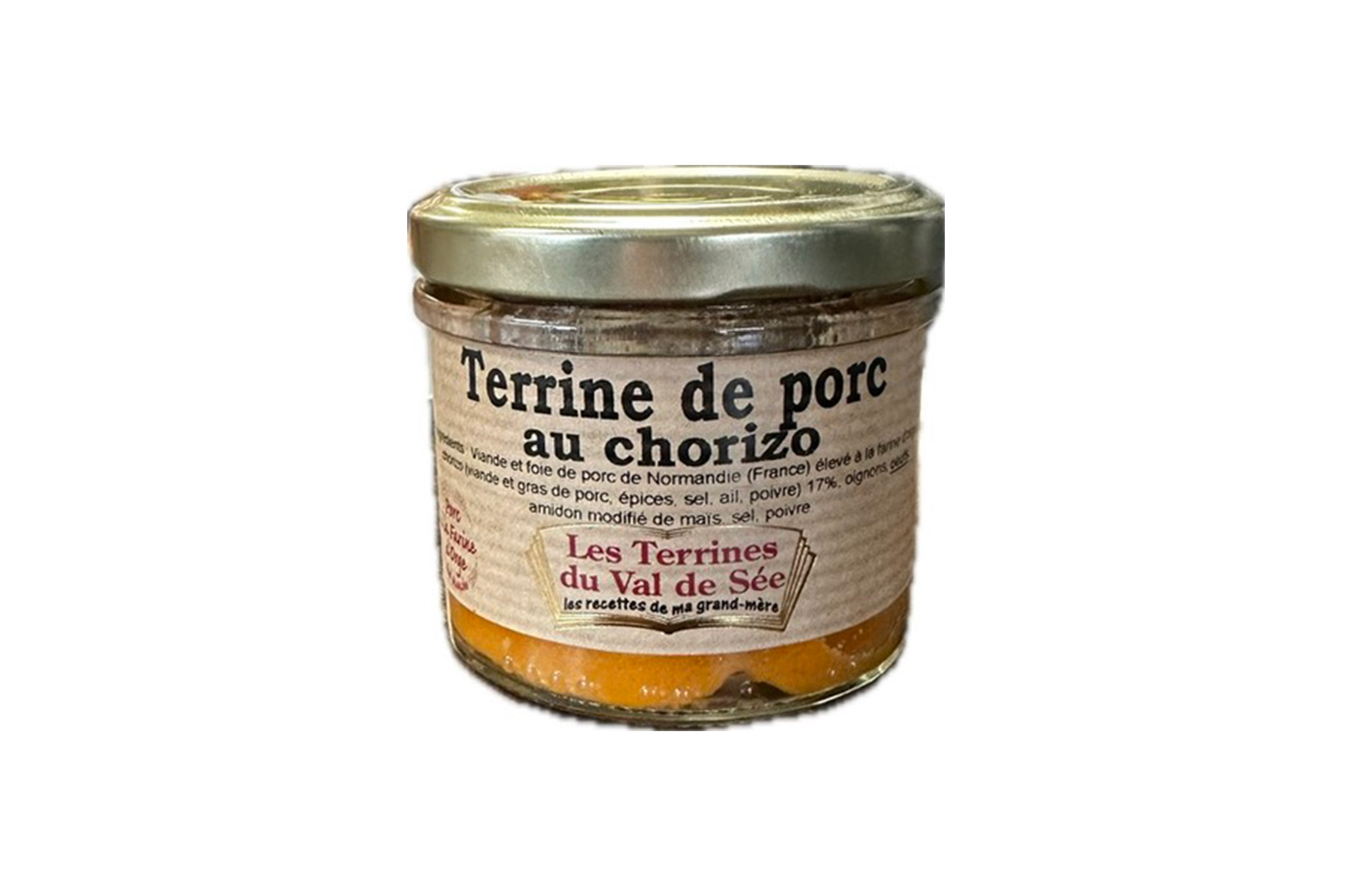 Ingrédients : Viande et foie de porc de Normandie (France) élevé à la farine d’orge, chorizo (viande et gras de porc, épices, sel, ail, poivre) 17%, oignons, OEUFS, amidon modifié de maïs, sel, poivre.