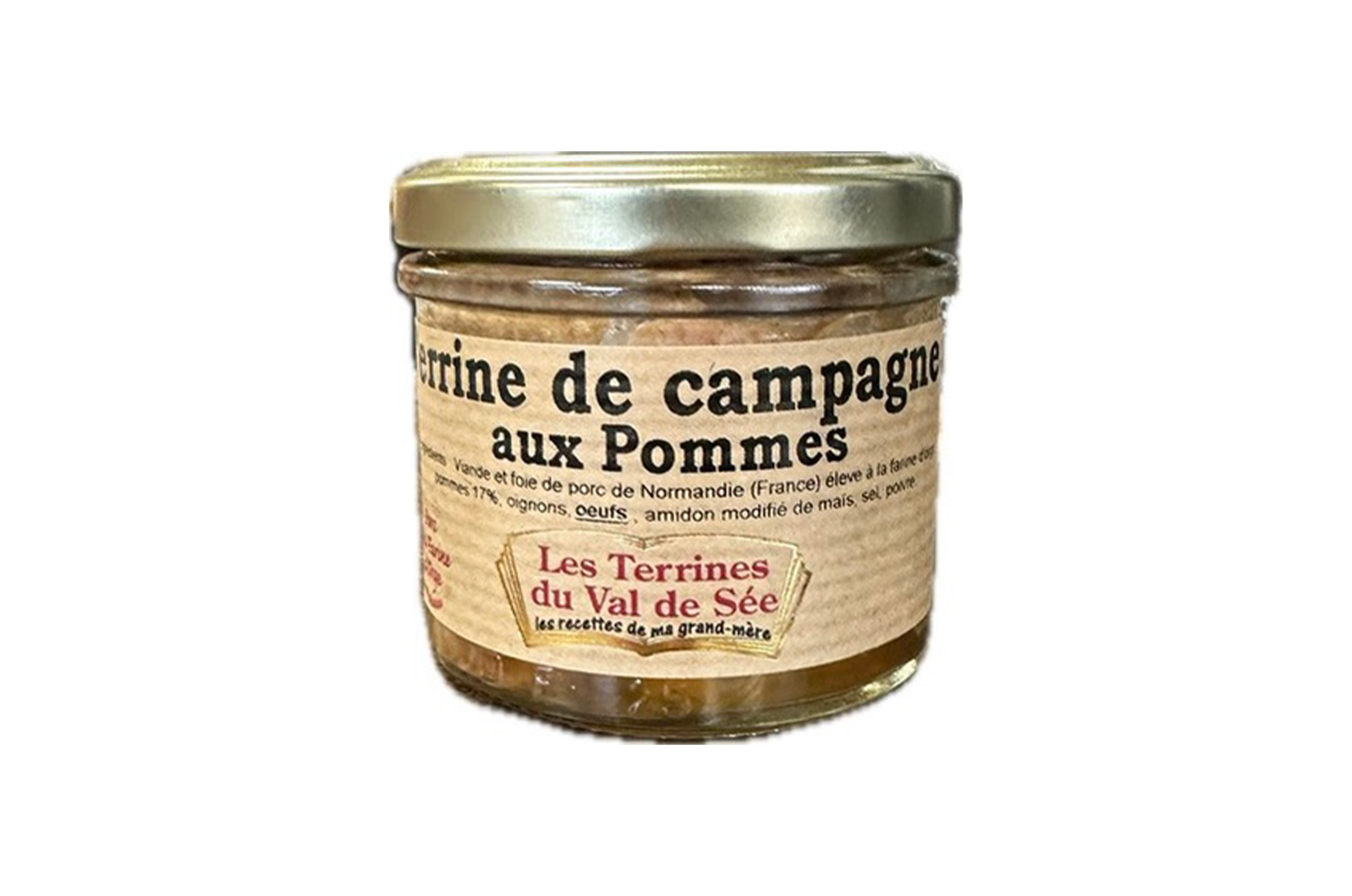 Ingrédients : Viande et foie de porc de Normandie (France) élevé à la farine d’orge, pommes 17%, oignons, OEUFS, amidon modifié de maïs, sel, poivre.
