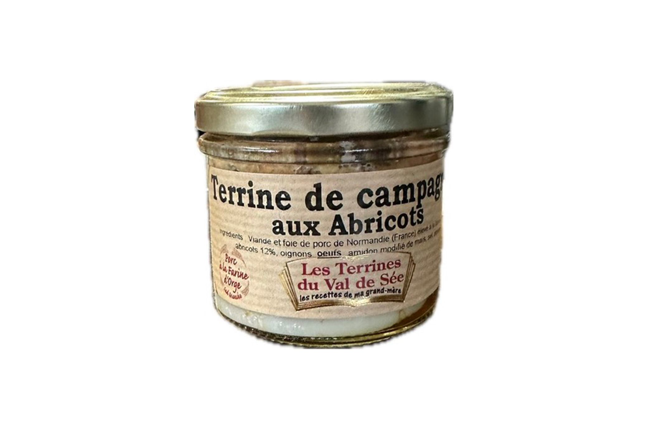 Ingrédients : Viande et foie de porc de Normandie (France) élevé à la farine d’orge, oignons, abricots 12% OEUFS, amidon modifié de maïs, sel, poivre.